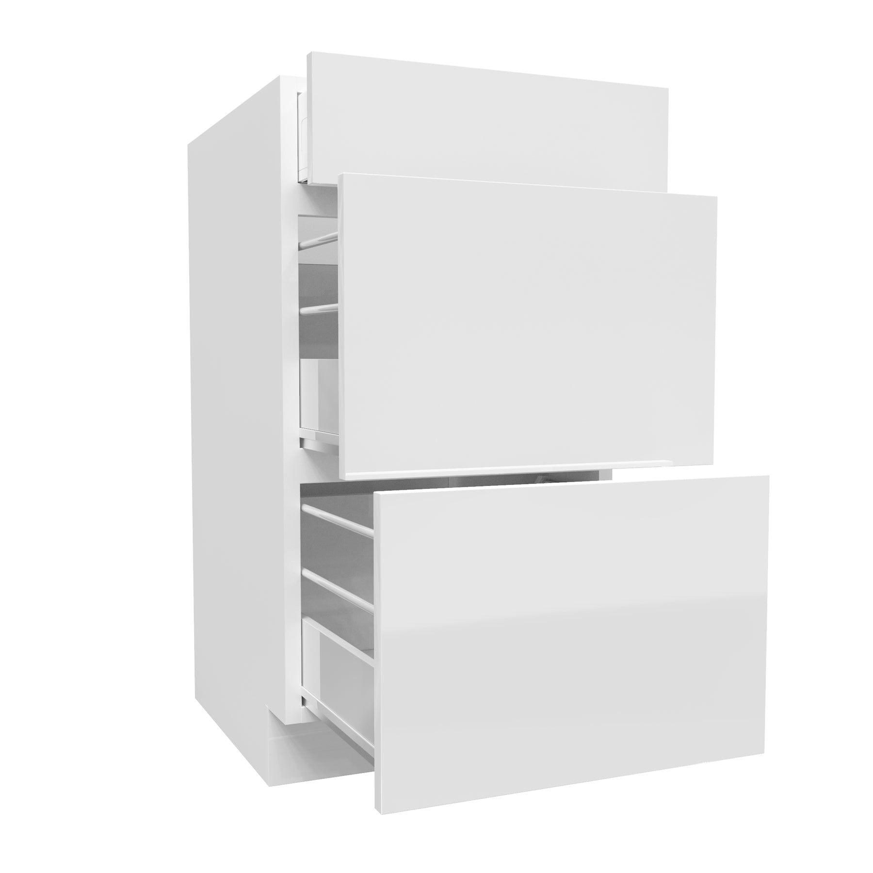 Vanity Drawer Base Cabinet | Milano White | 18W x 34.5H x 21DThe Milano Collection is composed of 3/4" vinyl laminated plywood with a frame-less box construction. The metal drawers are outfitted with full extension, under-mount drawer glides, as well as the soft-close feature. The adjustable soft close hinges, 3/4" adjustable full-depth plywood shelves, and dowel and glue-clamped assembly construction create a solid, durable framework for your cabinetry. Features:
