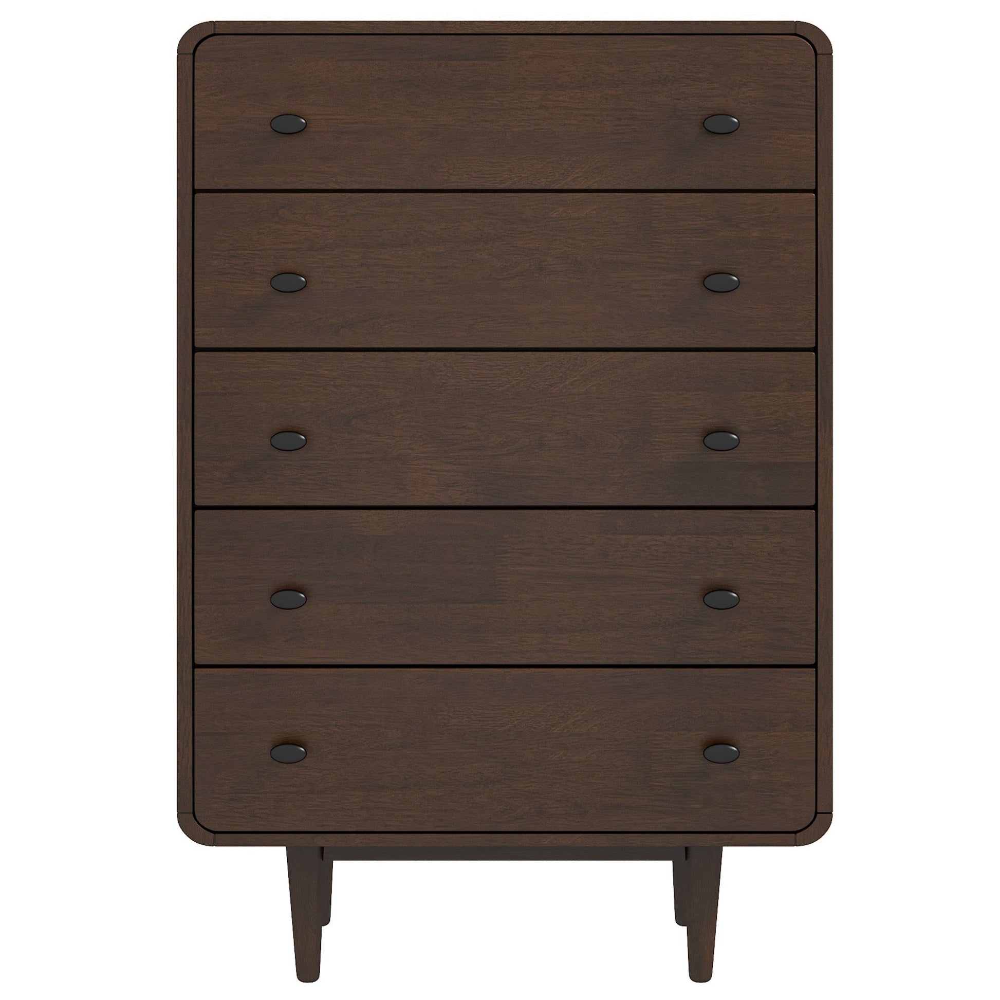Infuse your space with the retro charm of mid-century modern design with this dresser, crafted from durable solid wood. Partial assembly is required, simplifying setup while ensuring structural integrity. Its tapered legs evoke a vintage aesthetic, complemented by a solid furniture pattern for enduring style. With five spacious drawers, this dresser offers ample storage to keep your essentials organized and easily accessible.