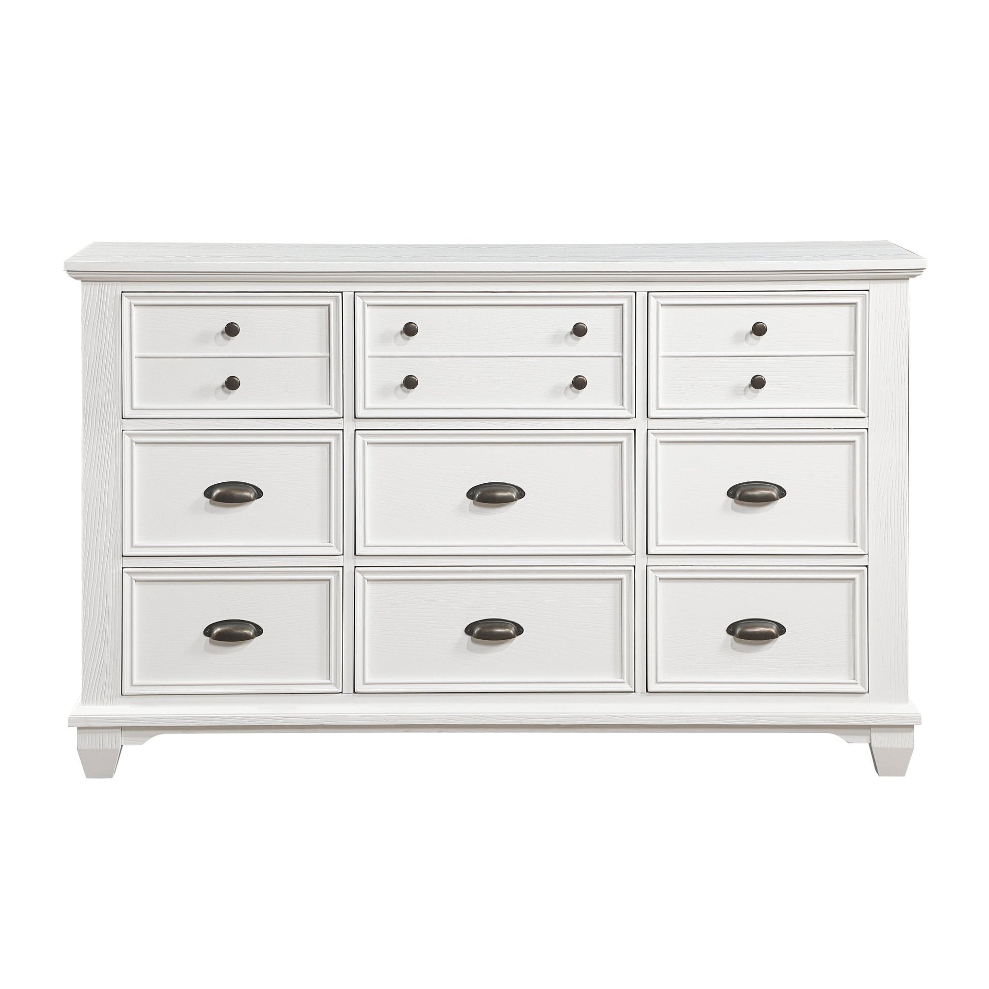 Capture the essence of carefree beach days and serene country afternoons with our dresser, seamlessly blending charming aesthetics with classic home decor. The traditional framing, adorned in a refreshing white finish, brings timeless appeal to your bedroom. The dresser showcases knob and cup pull hardware in an antique brass finish, creating complementing contrast and charming accents against. Crafted from solid acacia wood and embossed engineered wood, it ensures durability and enduring style. With nine dovetail drawers featuring ball-bearing glides, this dresser offers both practical storage and an elegant touch.