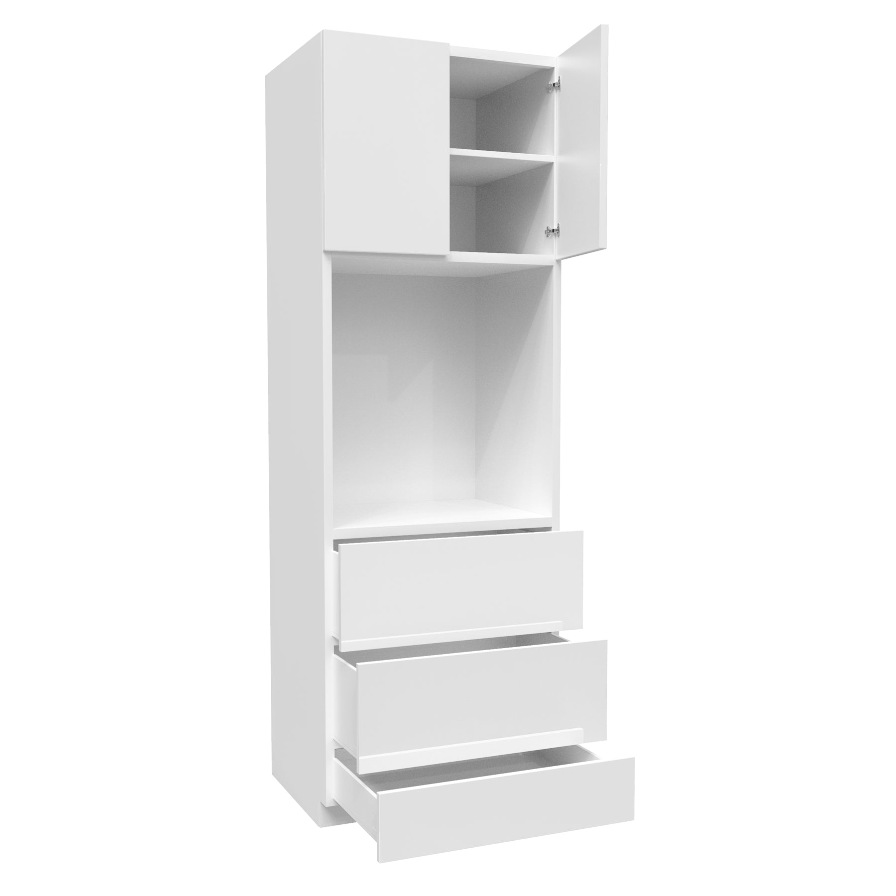 Single Oven Cabinet | Milano White | 30W x 90H x 24DThe Milano Collection is composed of 3/4" vinyl laminated plywood with a frame-less box construction. The metal drawers are outfitted with full extension, under-mount drawer glides, as well as the soft-close feature. The adjustable soft close hinges, 3/4" adjustable full-depth plywood shelves, and dowel and glue-clamped assembly construction create a solid, durable framework for your cabinetry. Features: