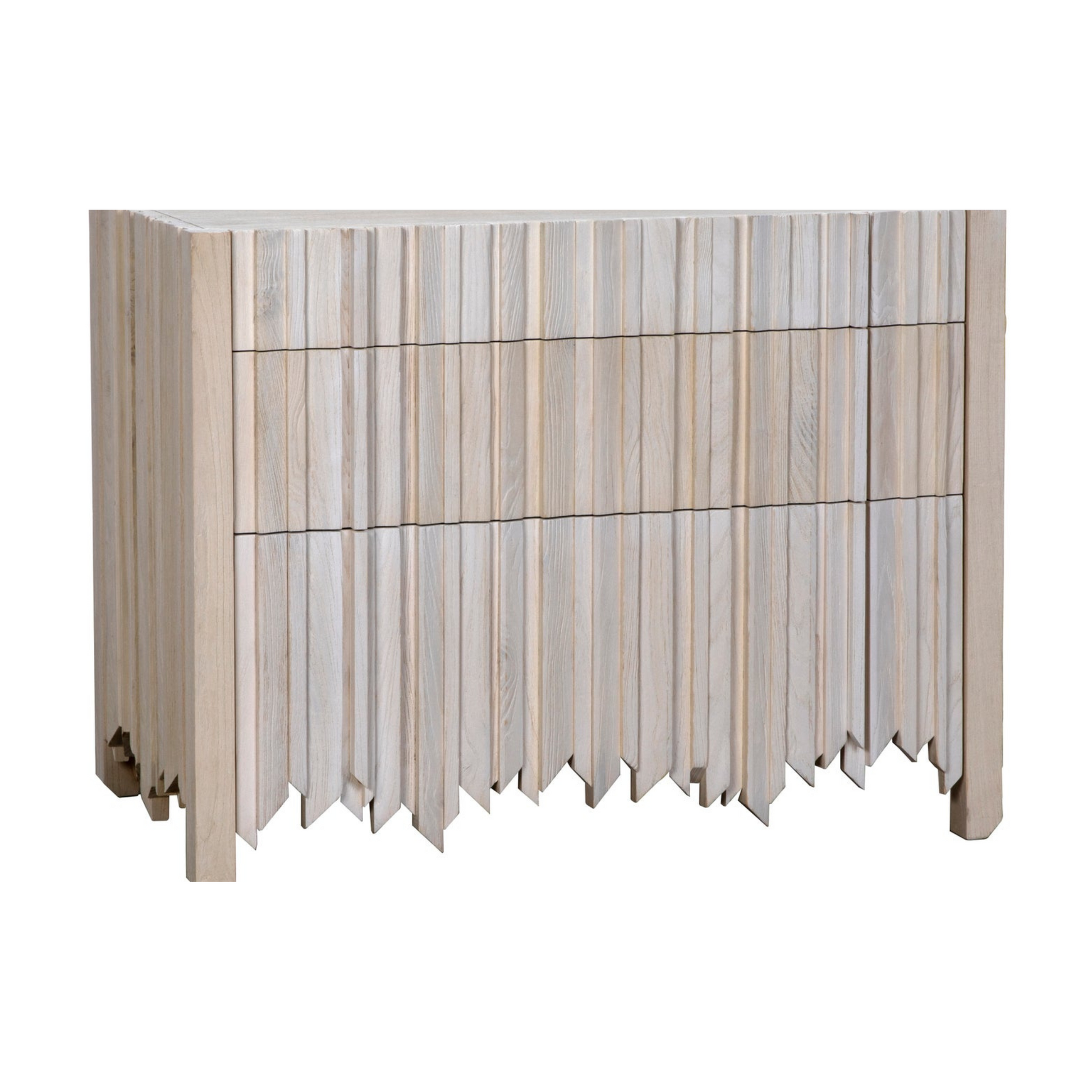 Combining the beauty and natural variations of bleached Elm and Ash wood, our Desdemona three-drawer chest shows off a vertical fringed picket design creating a waterfall effect of motion. Multiple placement options including nightstand and hall chest.
