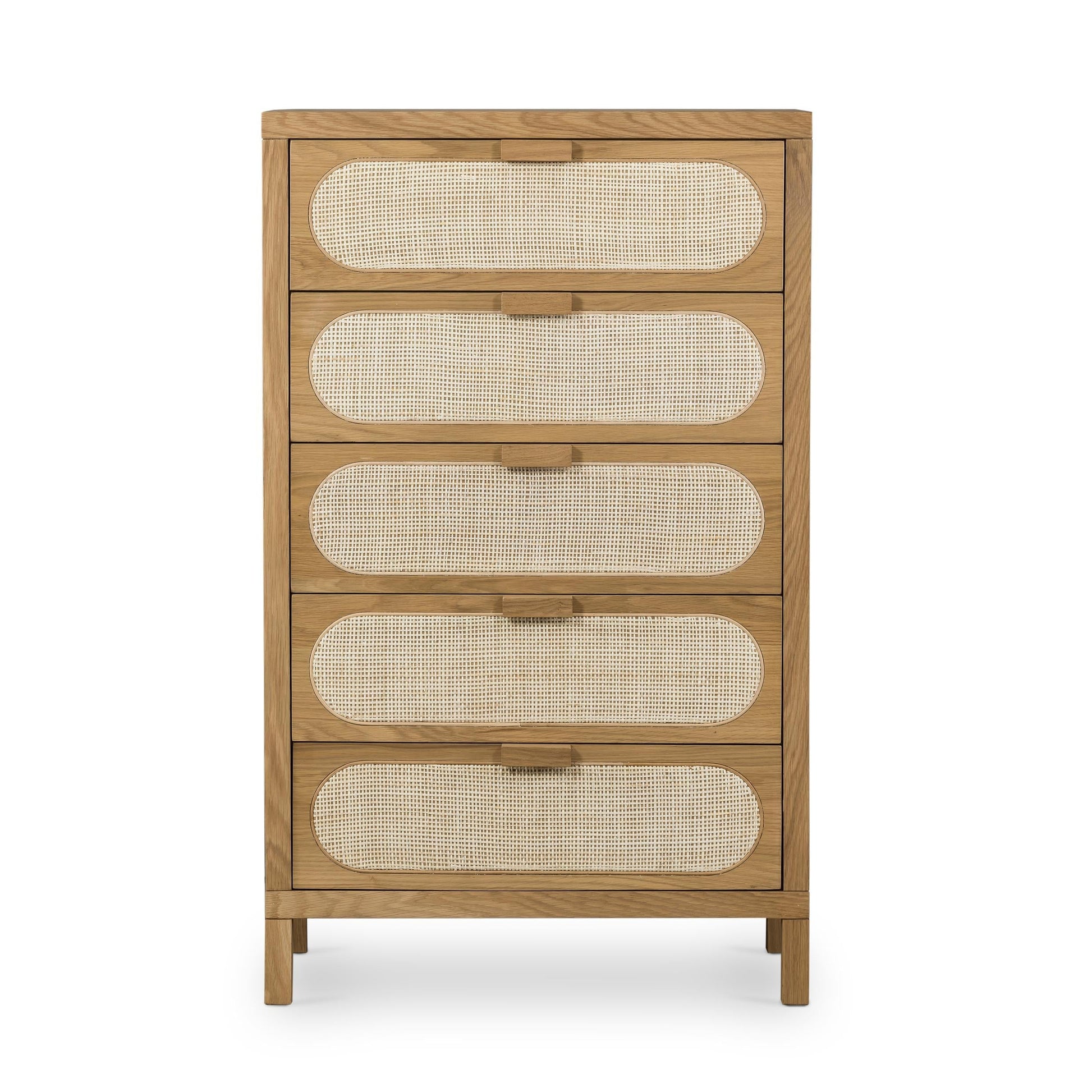 Au naturale. Honey-finished oak welcomes five spacious drawers with wood-backed cane paneling, for a soft, neutral look with lasting modernity.