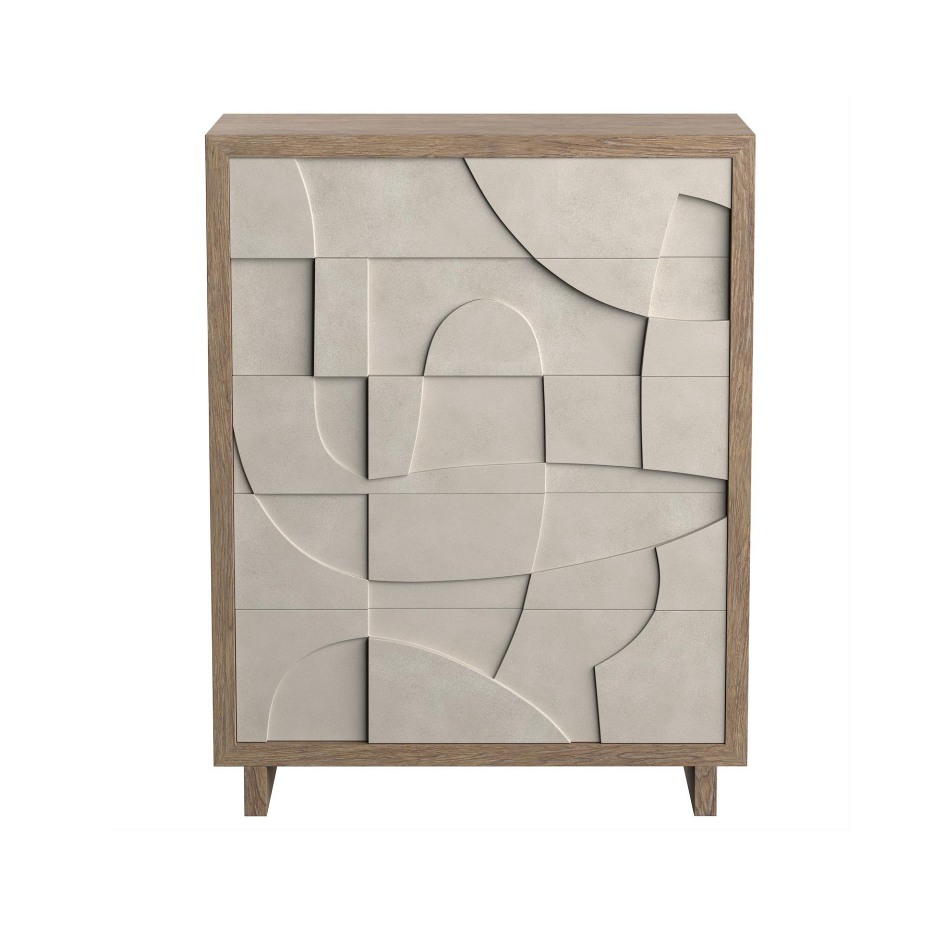 Texture and dimension carve a signature look onto the Amara tall drawer chest. Five faux concrete push-to-open drawers are showcased in Bedrock finish. The top and leg panels feature the warm Playa finish that provides the perfect contrast for a refined and rustic design.