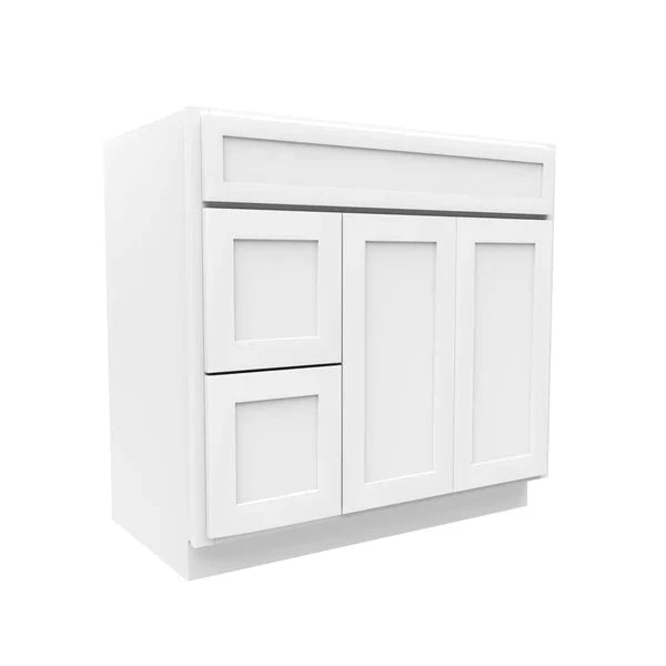 Aria Shaker White - Vanity Sink Base - 36"W x 34 1/2" x 21"D - 1D, 2 Left DRWThis cabinet line offers the finest quality cabinets at the lowest possible prices. Door Construction is of Solid Birch Frame & MDF Center; The Box Construction is Solid Wood Frame Plywood Box. Features: