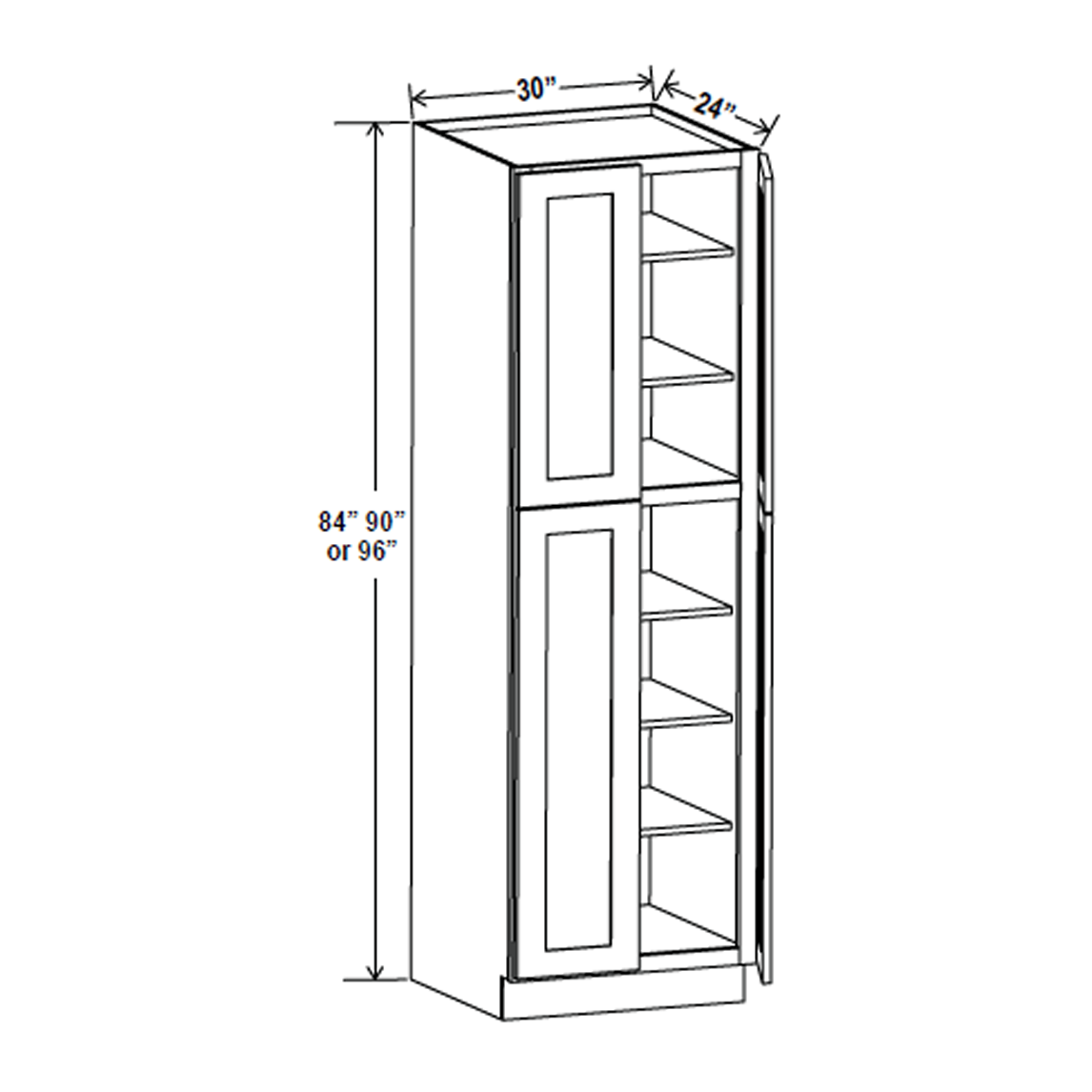 Aria Shaker White - Wall Pantry - 30"W x 90"H x 24"D - 4D, 5SThis cabinet line offers the finest quality cabinets at the lowest possible prices. Door Construction is of Solid Birch Frame & MDF Center; The Box Construction is Solid Wood Frame Plywood Box. Features: