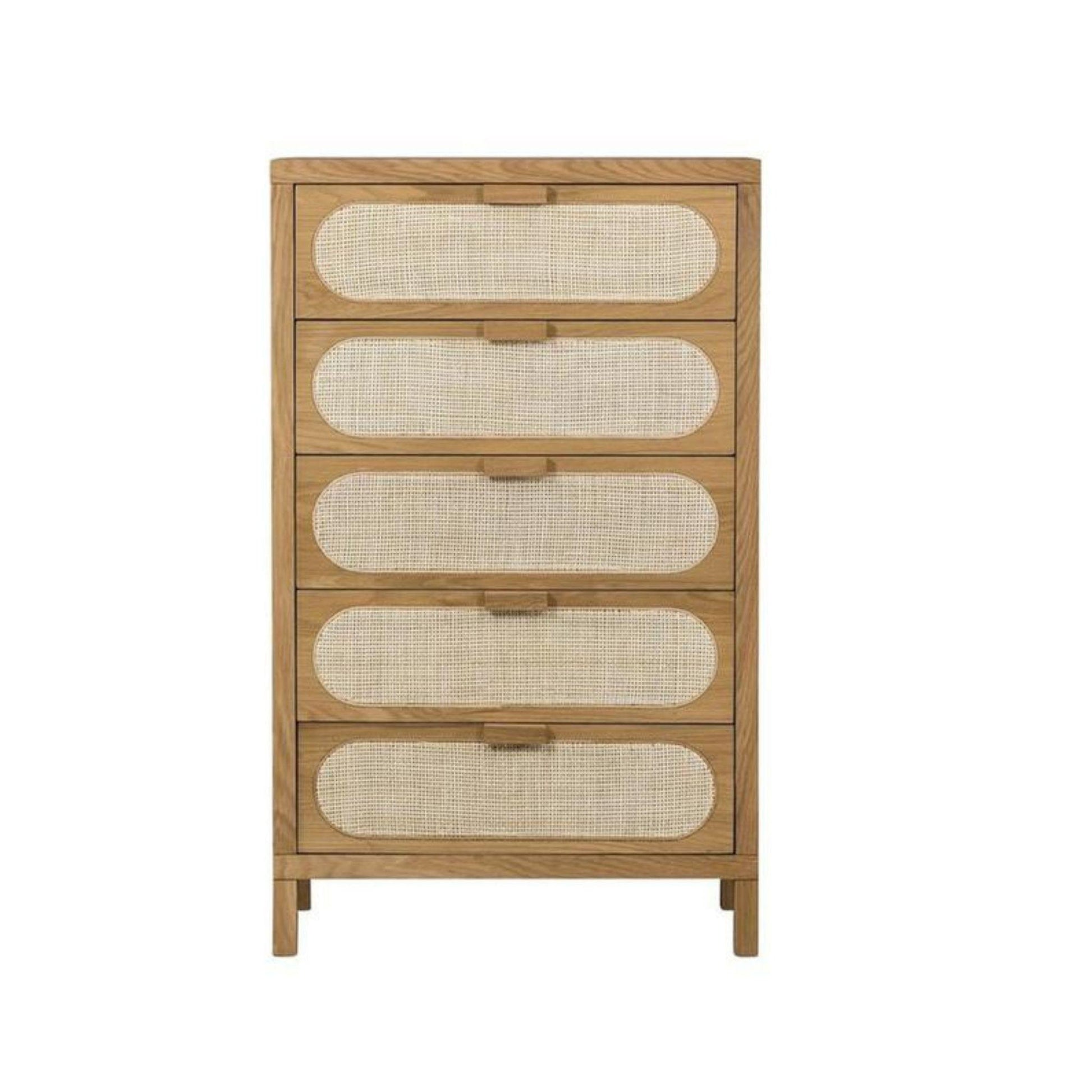 The five drawers of the Benjamin Dresser provide plenty of storage for organizing your belongings. The beautifully woven cane detailing of the drawers adds texture and warmth to your space.