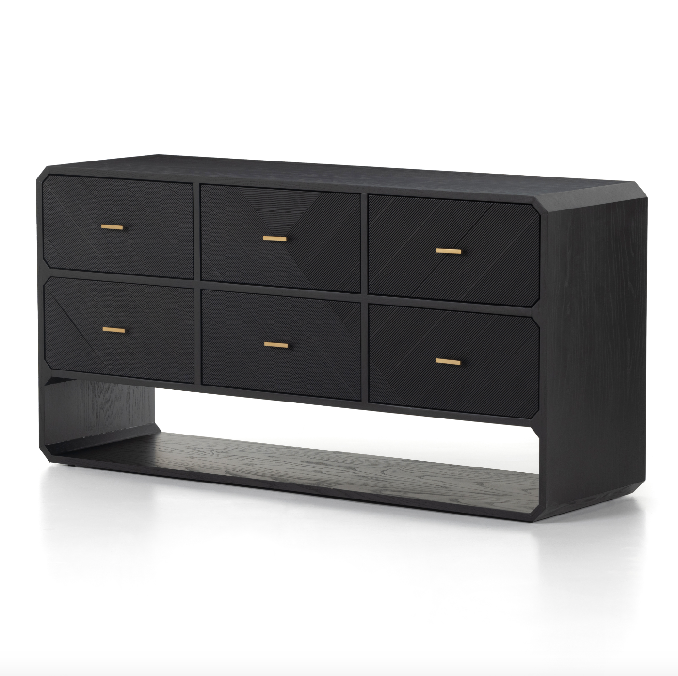 Channeling inspiration from the Seventies, this dresser adopts petite reeding for a linear look, with chamfered edging and an extended base for an open look with bonus storage.