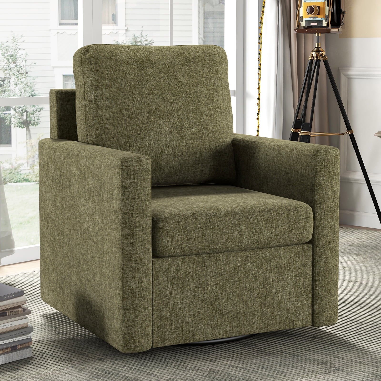 - This modern chair can be rotated 360 degree and has great flexibility in the house.The seat cushion of the chair is filled with a distinctive sponge, which is not only beautiful in appearance, but also more comfortable to ride. The seat is very wide, and its removable seat is easy to clean. The fabric of the chair adopts the rare chenille fabric on the market, which is skin-friendly and soft! The accent chair is a unique decor for various occasions which can lift up the aesthetic of the interior design. It is a perfect addition to the hotel lounge, bedroom, living room, office, and nursery room.
