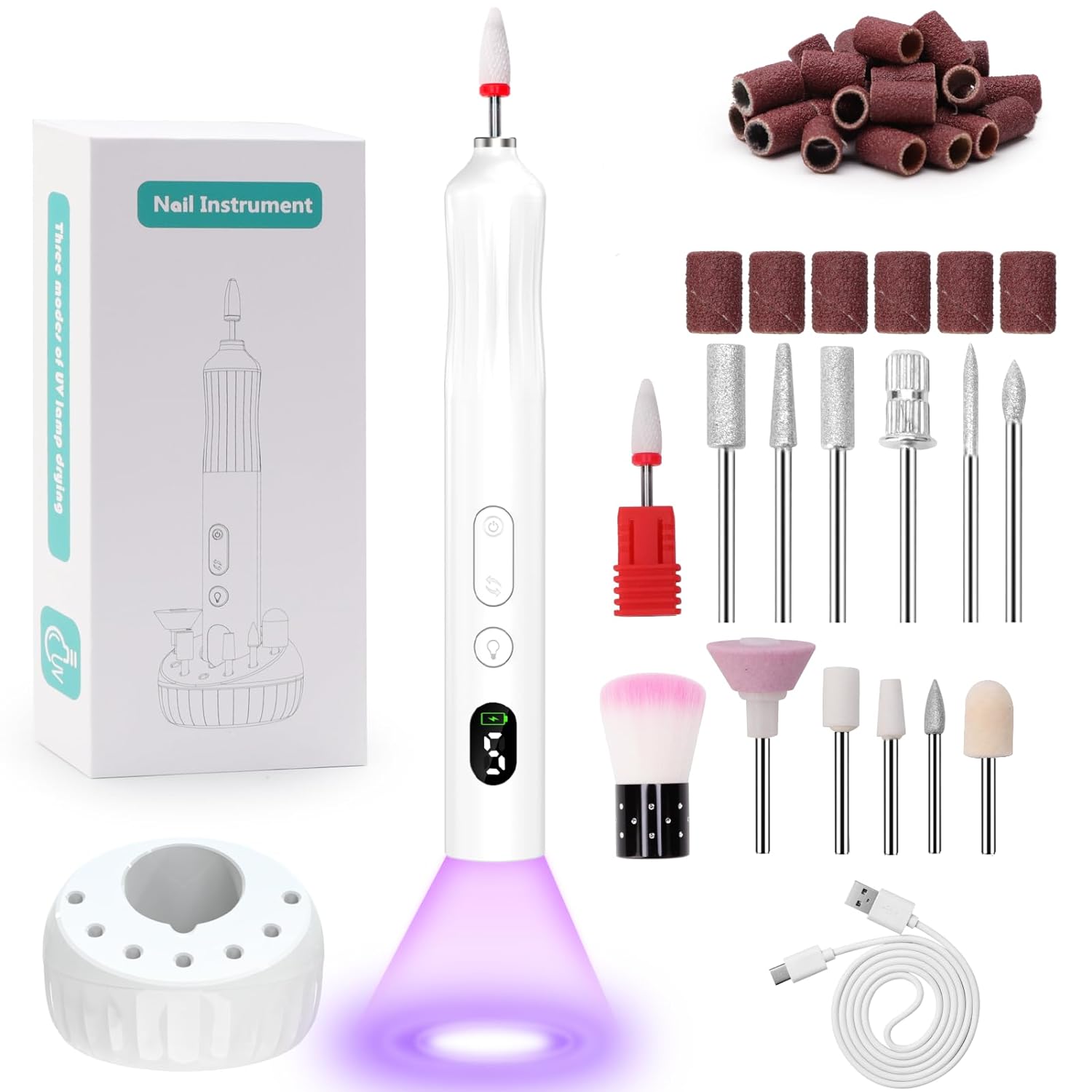 💅【Digital Display and Drying Light】This electric nail drill adds a drying light for you to easily attach your nails. It has 3 lighting time modes (20 seconds-60 seconds-15 minutes) to meet your various needs. In addition, our electric nail file is equipped with an Digital screen that clearly displays the current remaining battery power and speed. Bring you a comfortable manicure experience!