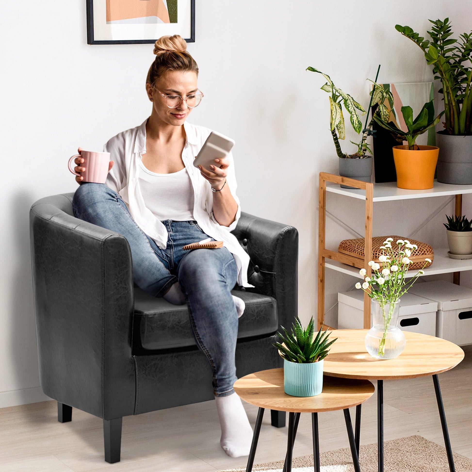 - EASY ASSEMBLY: Our Emma Faux Leather Gray Chair comes with easy, Step-By-Step instructions for assembly, which requires no tools and assembles in minutes. Our Proprietary Packaging ensures the safe delivery of the Button Tufted Barrel Tub Chair to your home. It comes with a 90 Day Manufacturer's Warranty and, in the unlikely event that you are not satisfied with our Accent Armchair, you can contact our customer service for return/refund.