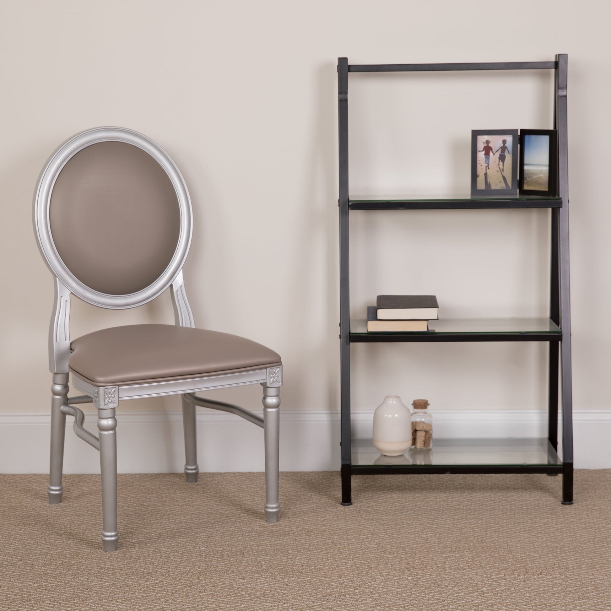 Everyone knows a good chair takes the whole evening up a notch. This gorgeous sculpted King Louis chair with Taupe Vinyl Back and Seat and Silver Frame will be the focal point in any area of the home or formal setting. Use in the dining room, as a desk chair, banquet chair or in any exquisite setting. Distinctive details such as the etched design square blocks at the top of the front legs and serpentine side braces abound in this beautiful piece. The classic upholstered, rounded back and fluted legs provide a graceful elegant look that is sure to please . Upgrade your furnishings with this durably crafted resin chair that will remain beautiful throughout the years.Classic Style Vinyl Padded Rounded Back Removable Taupe Vinyl Seat CA117 Fire Retardant Foam Fluted Legs Silver Resin Frame Designed for Commercial and Residential Use
