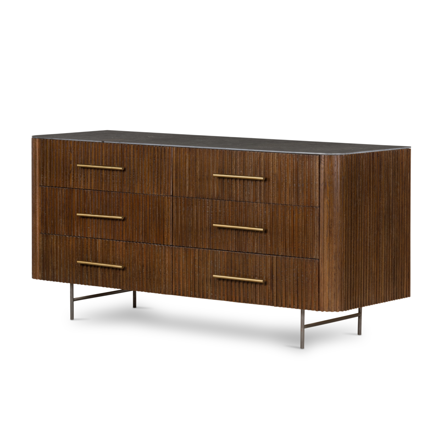 Rich with reeding for great texture and a linear look, solid oak flaunts six spacious drawers with polished brass hardware and coolly curved corners, while a bluestone top brings a beautifully complementary material mix to bedroom storage.