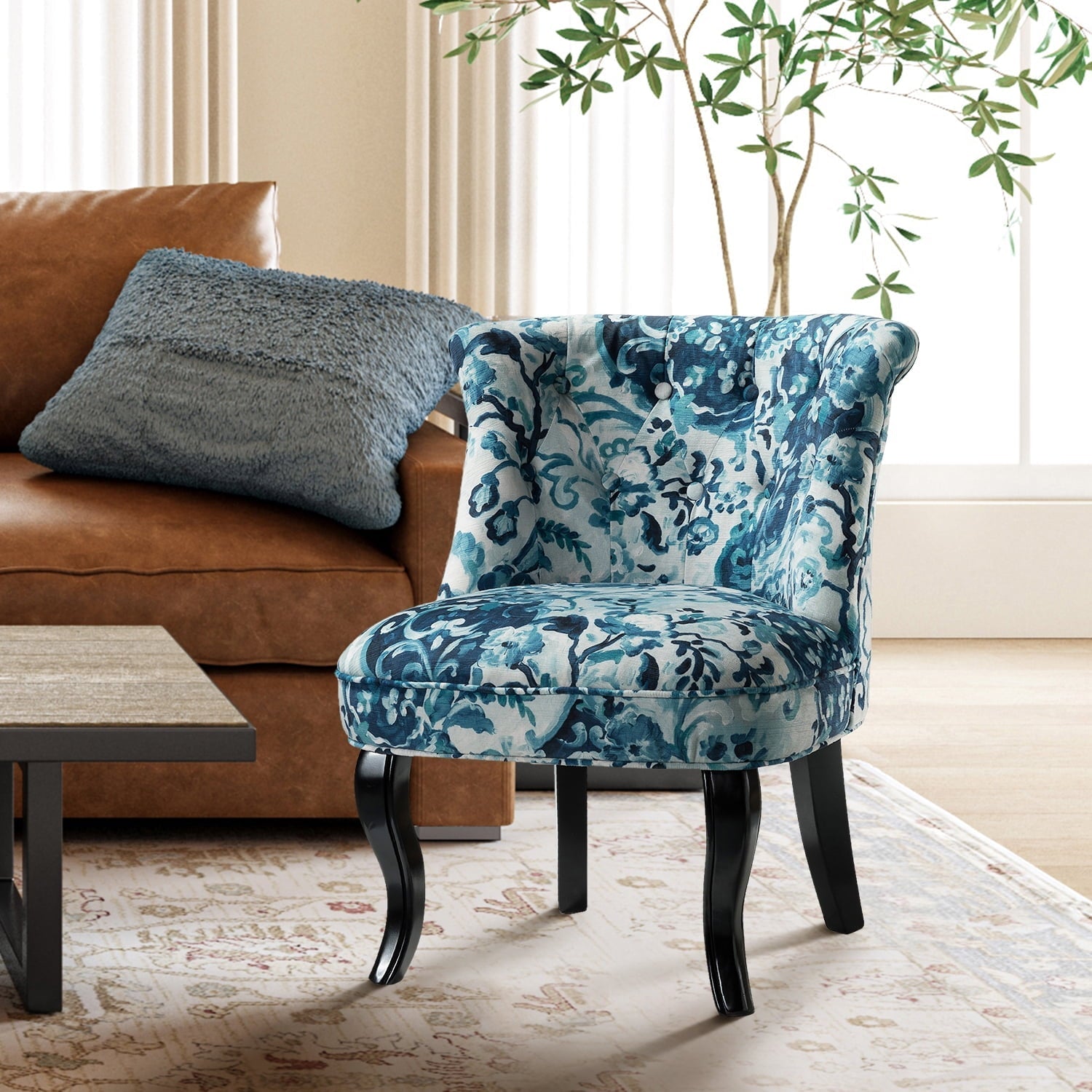 Floral Fabric Accent Chair Upholstered Makeup Vanity Table Button Single Sofa Wooden Legs Dining Bedroom Indigo