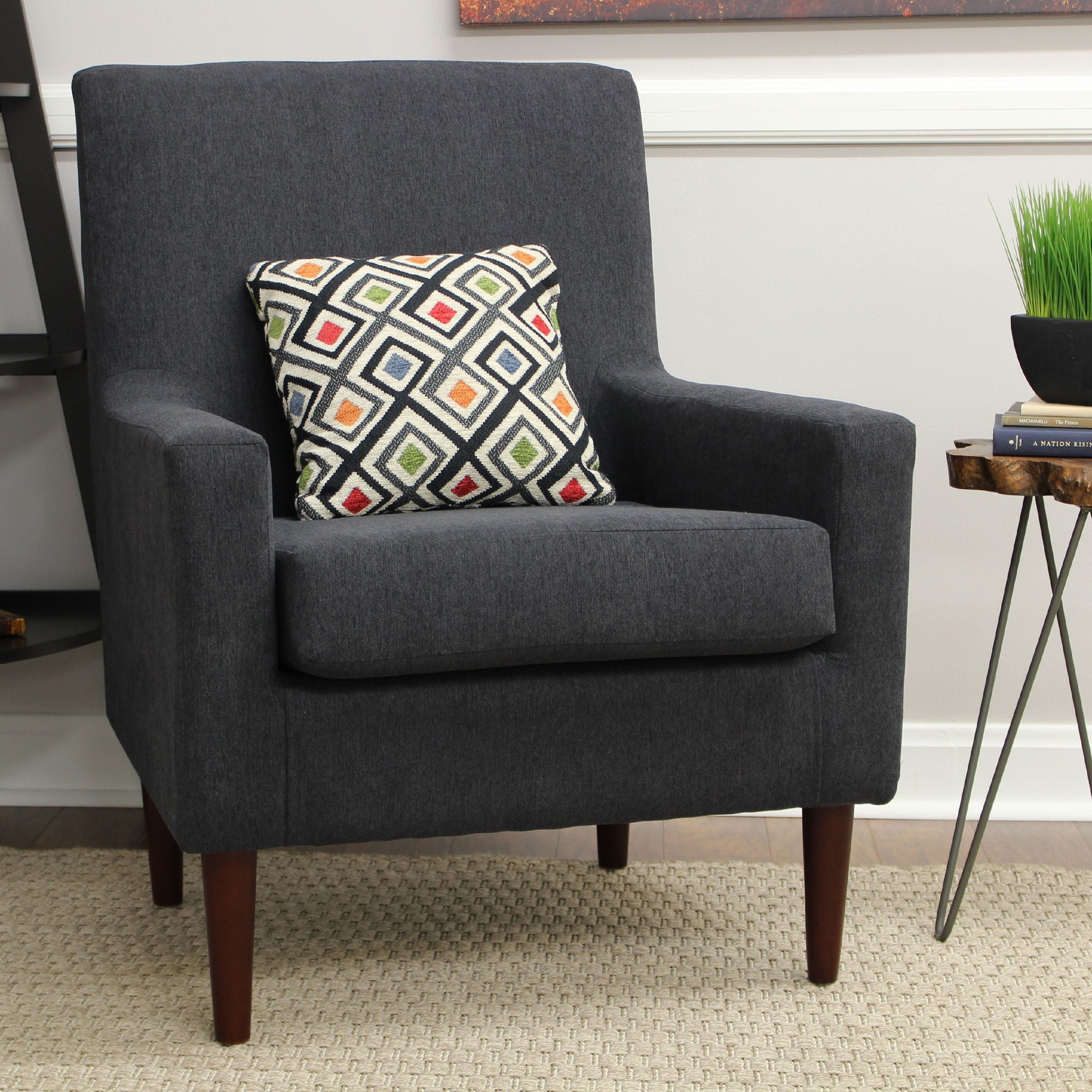Modernize any room in your home or office space with this elegant Fox Hill Emma Lounge Chair. It's constructed of a sturdy wooden frame and includes a removable foam seat cushion covered with woven upholstery fabric. The track arm design gives this lightweight accent chair a distinctive look that blends in well with any decor. The wooden legs simply screw on for quick assembly, and the height of this comfortable chair makes it easy for you to vacuum underneath. It will quickly become your favorite place to sit and relax when you get home from work or want to get the baby to sleep. Use this lightweight lounge chair as a room anchor seating group in your living room or match it with a fun throw pillow. It comes in a wide variety of color options, so you're sure to find just the right fit and style.