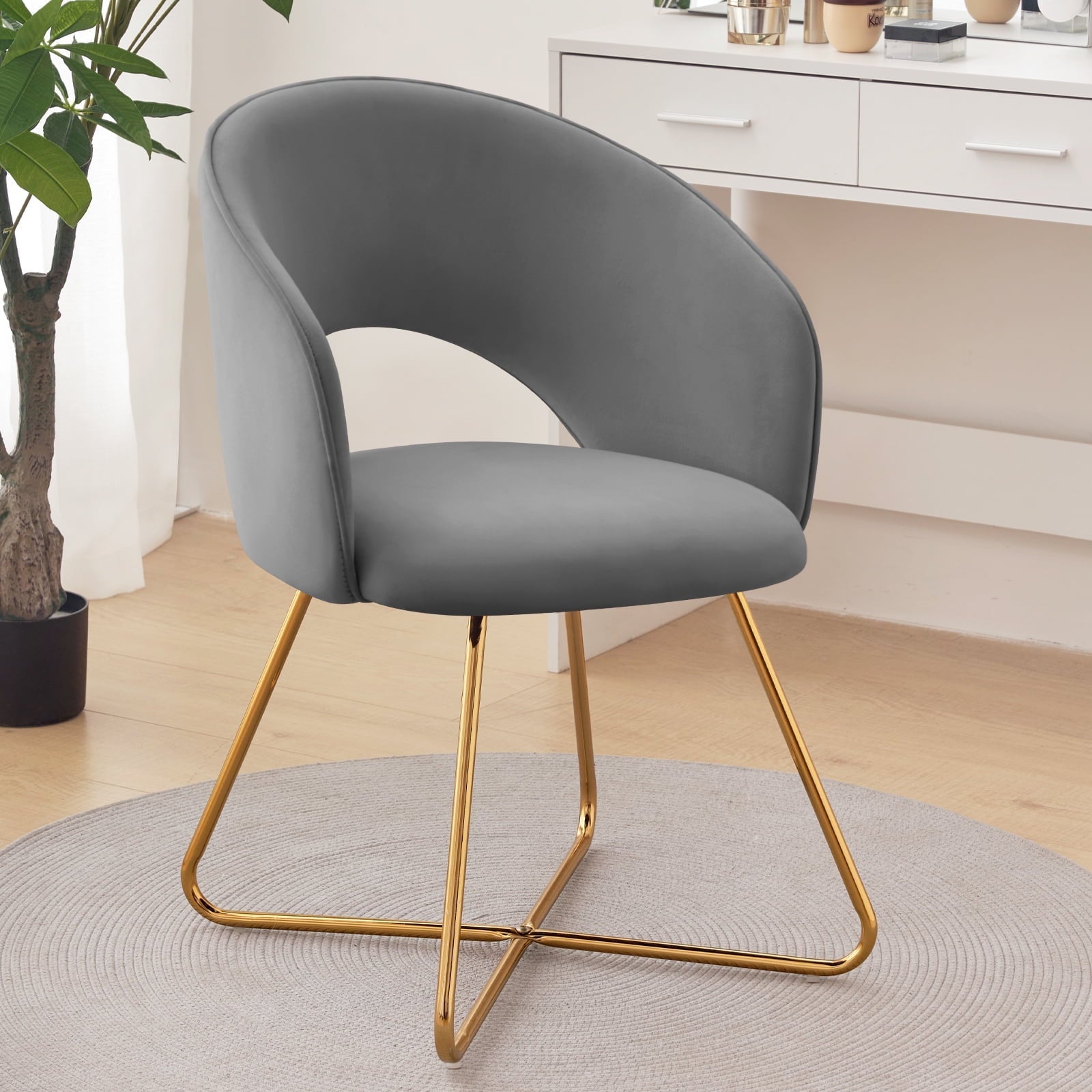 Cross-shaped gold legs support the silky velvet seat and bring seating luxury. Such a combination has not only a nice visual effect but also a comfortable sitting experience. Ideal in the living room, bedroom, entryway, dining room, balcony, pub, makeup, vanity, coffee shop or office. This office chair reception is super stylish and sure to match any decor.A padded sponge cushion covered with skin-friendly velvet touch fabric offers you excellent comfort and encourages you to sit and relax. A sturdy golden metal base ensures leisure chair stability. The circular backrest contours to your body, which is good for your waist.Sturdy cross metal base design ensures stable under different posture. Rigorously tested metal frame matches the high density foam add the steady of the whole chair. The sturdy metal frame is finished in gold tone, with plastic floor protector underneath to make your floor scratch-free.