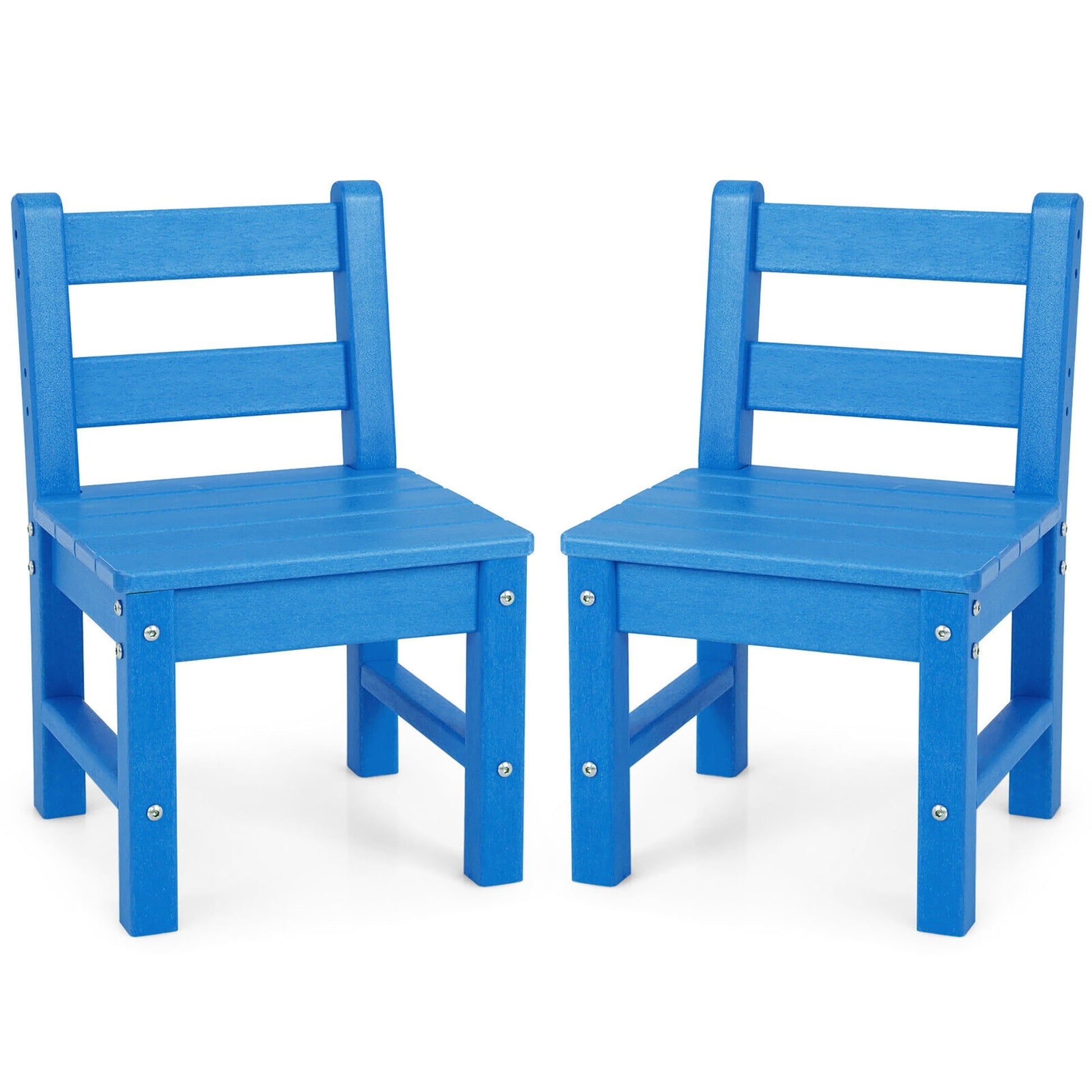 Description: Unlike other kids chairs made of wood and plastic,our kids chair uses high density polyethylene material which is not only waterproof and anti-fading but also not easy to crack or peel under long time sun exposure. In addition,our kids chair is much heavier than others on the market,avoiding shaking or movement in strong wind and heavy rain. The slatted seat effectively prevents water accumulation after the rain,and the cleaning is convenient with a cloth. Besides,the weight capacity is up to 165 lbs. Equipped with wide backrest and spacious seat,kids can sit comfortably on this chair. Features: Made of waterproof,sun protection,anti-fading,high hardness and anti-corrosion HDPE material Heavy-duty structure makes the chair stand firmly in strong wind or rainSpecification: Color: Blue Material: HDPE Chair Dimension: 14'' x 13'' x 22.5'' (L x W x H) Backrest Dimension: 13.5'' x 10.5'' Seat Height: 12'' Weight Capacity of Each Chair: 165 lbs Net Weight of Each Chair: 12.5 lbs Package includes: 2 x Chairs 1 x User Guide