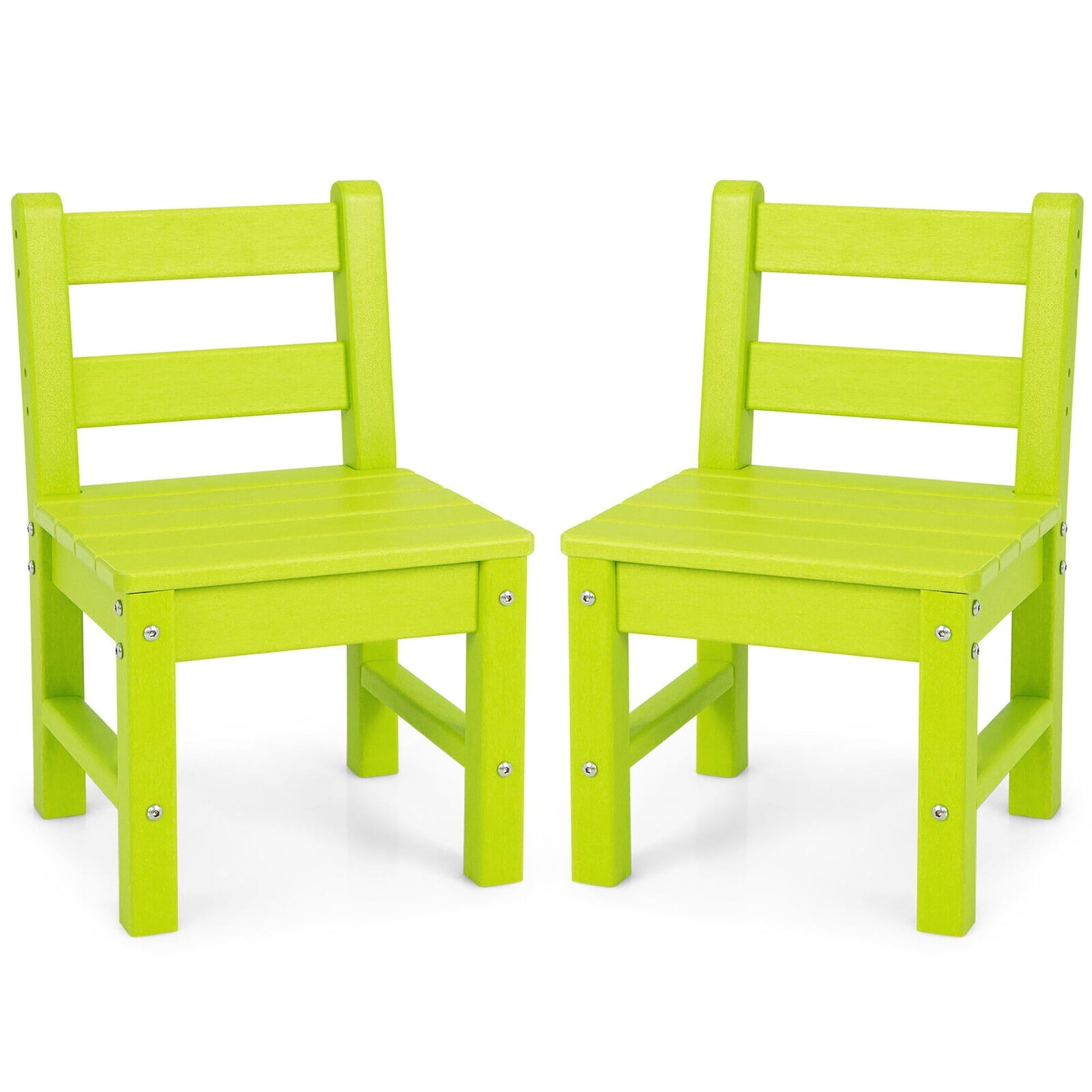 Description: Unlike other kids chairs made of wood and plastic,our kids chair uses high density polyethylene material which is not only waterproof and anti-fading but also not easy to crack or peel under long time sun exposure. In addition,our kids chair is much heavier than others on the market,avoiding shaking or movement in strong wind and heavy rain. The slatted seat effectively prevents water accumulation after the rain,and the cleaning is convenient with a cloth. Besides,the weight capacity is up to 165 lbs. Equipped with wide backrest and spacious seat,kids can sit comfortably on this chair. Features: Made of waterproof,sun protection,anti-fading,high hardness and anti-corrosion HDPE material Heavy-duty structure makes the chair stand firmly in strong wind or rainSpecification: Color: Green Material: HDPE Chair Dimension: 14'' x 13'' x 22.5'' (L x W x H) Backrest Dimension: 13.5'' x 10.5'' Seat Height: 12'' Weight Capacity of Each Chair: 165 lbs Net Weight of Each Chair: 12.5 lbs Package includes: 2 x Chairs 1 x User Guide