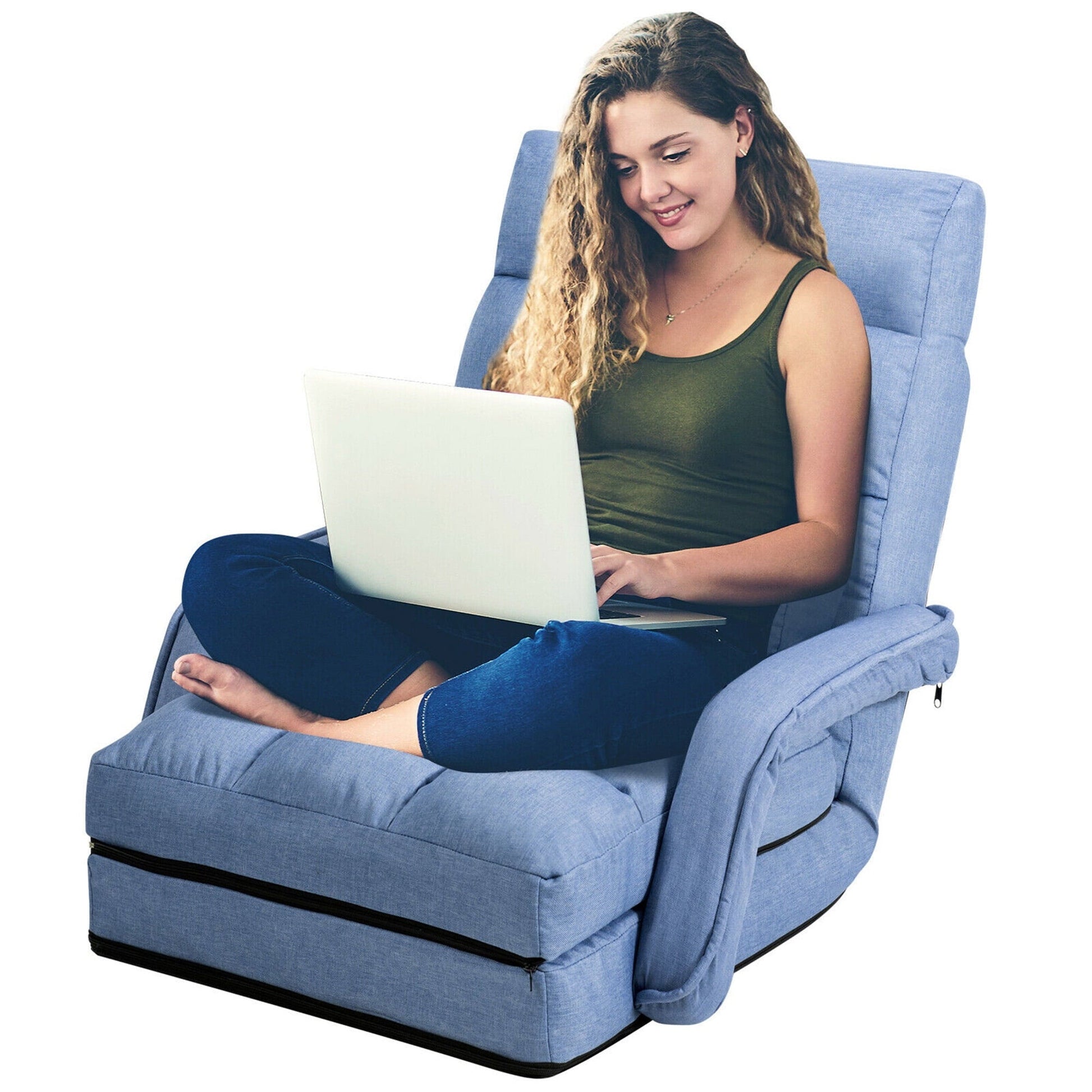Description: Sometimes you just want to have some chill time on a comfortable lounge, but not a whole couch;this is the one that you can get. It is great for a living room, home office,or dorm room. You can adjust the back support in 6 different angles and you can reach the most comfortable position for yourself to watch TV, work on a laptop,or take a catnap. Added comfortableness with armrests, give you a more pleasantexperience using this lounge bed. When you're finished, simply fold it andstore it away. Features: Steel frame for a longtime use Padded with soft sponge and polyester fiber for comfortable use A great room furniture for a living room, home office, or dorm room A nice pillow forcomfortably resting Armrests for your arms to rest on and giving a cozy reading time Easily fold up and convenient storageSpecification: Color: Blue Material: Linen-like Cloth + Steel + Sponge Overall Dimensions: 27.5'' x 26'' x 29'' (L x W x H) Folding Size: 27.5'' x 26'' x 14'' (L x W x H) Net Weight: 21 lbs Pillow Size: 21'' x 8'' Package Includes: 1 x Folding Floor Armchair 1 x User's Manual