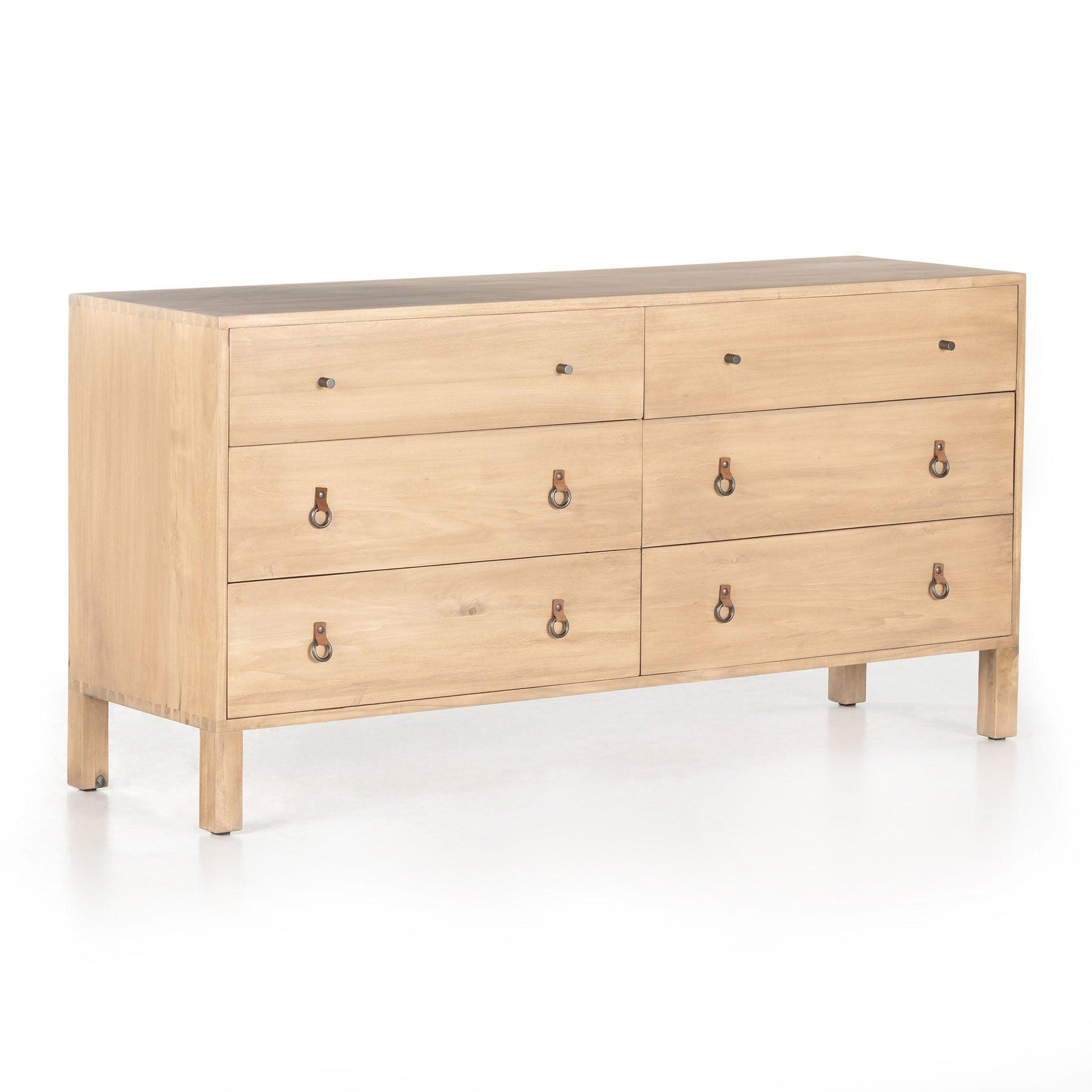 Beautifully simple in spirit, the Hadley Dresser. Solid dry-washed poplar forms a spacious six-drawer dresser, with dovetail joinery plus iron and leather hardware for a fresh, material-driven update to Shaker-inspired styling.