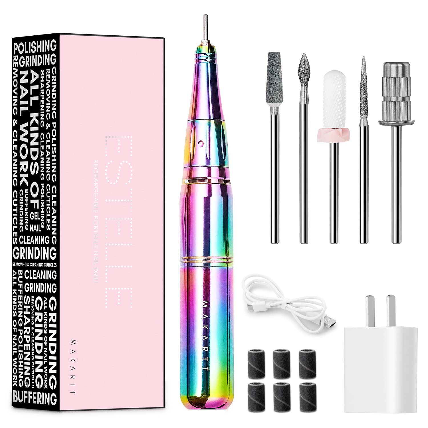 - Professional Nail Drill Kit: Comes with 1pc hight quality nail filer electric, 5pcs nail drill bits, 6Pcs sanding bands and one USB cable in a Makartt sepecail gift box. Great ideal as gift for girl friend, sister, mother, nail lover and nail techniciant.