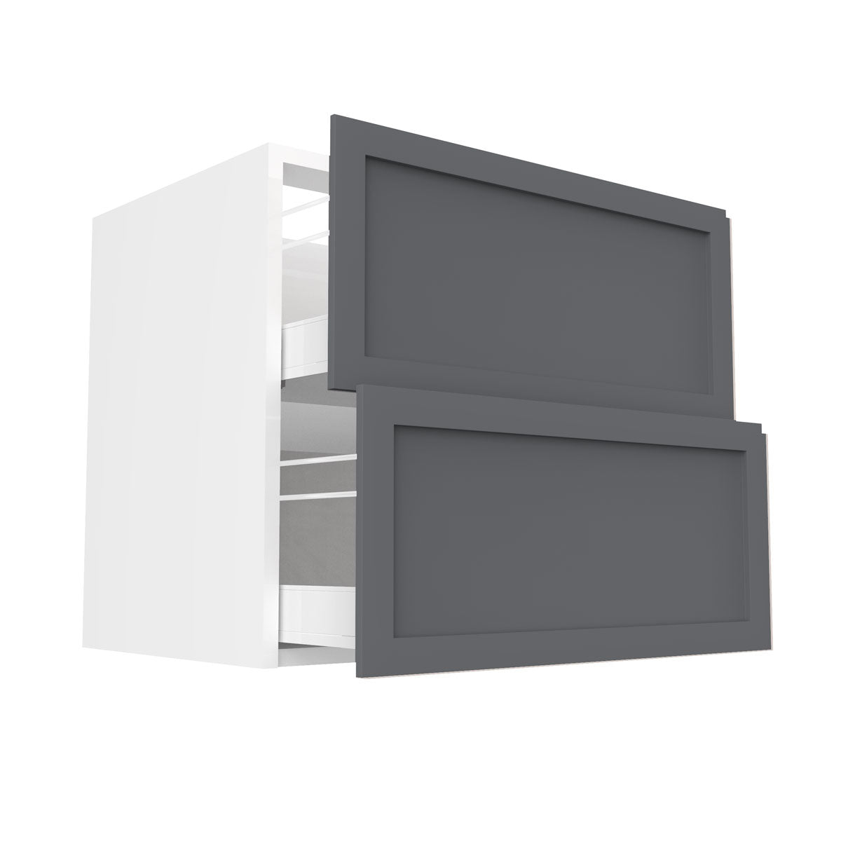 This cabinet line uses frameless construction of cabinets consists of using flat panels of engineered wood rather than traditional frame and panel construction. This allows for full access to cabinet space while also providing straight clean lines that offer a sleek and modern aesthetic.