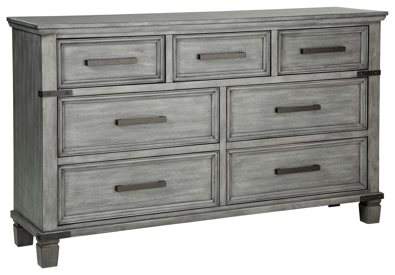 What's old is what's new with this dresser. Serving up a fresh look in urban farmhouse style, this eclectic piece features a light weathered gray finish with dark aged bronze-tone accents and metal straps for a casually cool sensibility. Profiled drawer frames, thick-profiled top moulding and tapered legs are the earmarks of timeless design.
