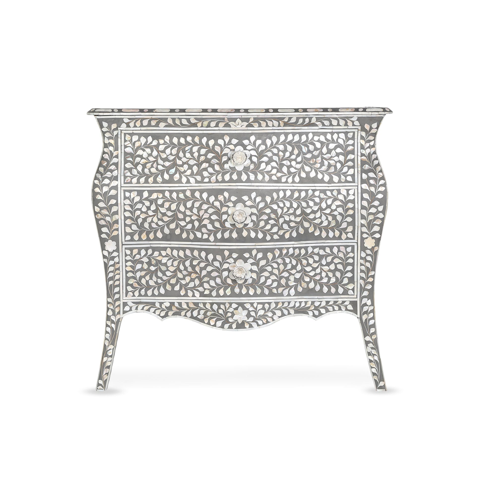 The classic bombe chest undergoes an almost magical update with inlaid leaves and vines stretching down its legs and across its drawers. To create this dresser, the pieces to be inlaid (either bone or mother-of-pearl) are carefully cut into intricate shapes, polished, and applied to the frame in various patterns. Resin is then poured into the recesses to achieve a smooth, stunning surface that is both Old World and refreshingly modern. Choose between bone or mother-of-pearl inlay.