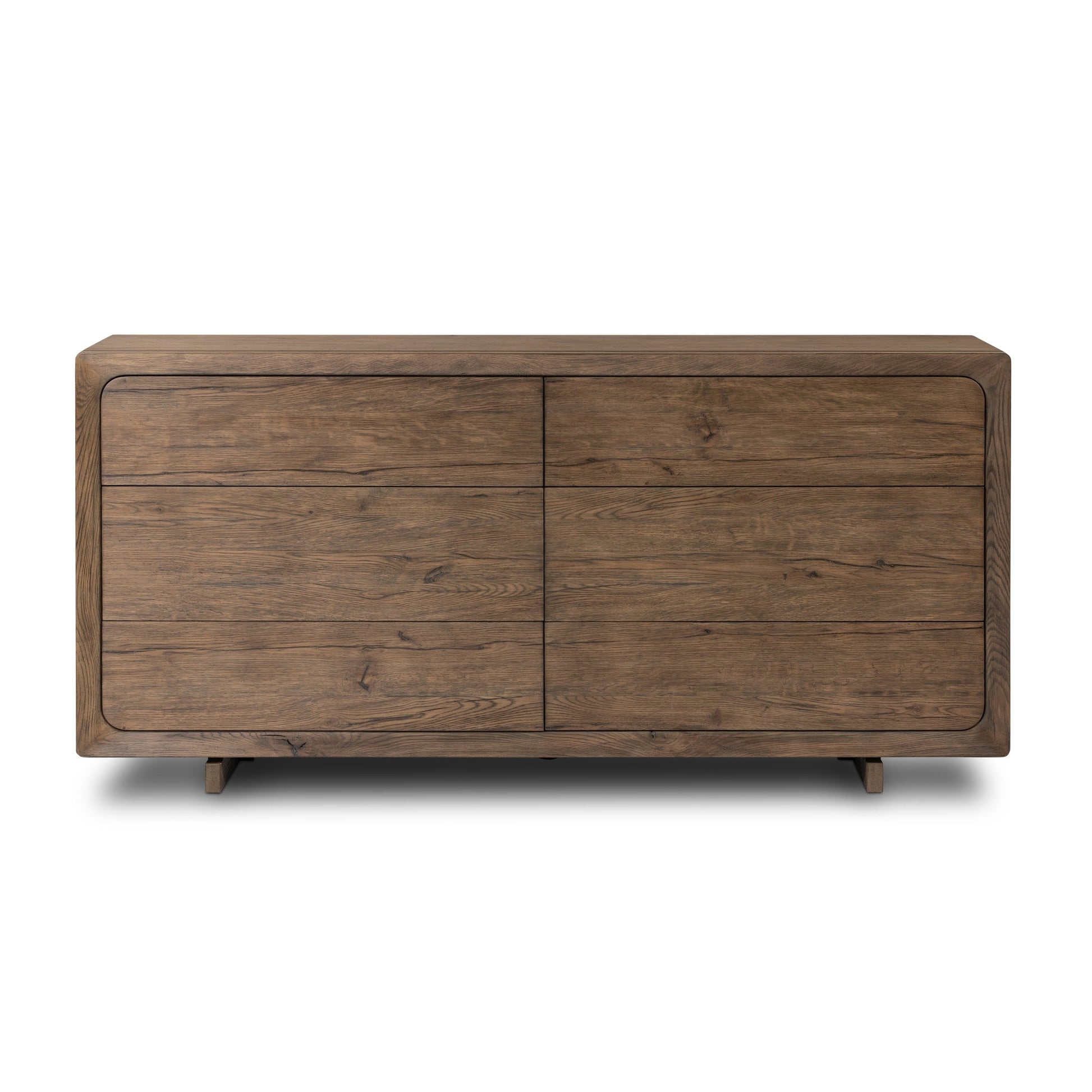 Made from solid reclaimed oak finished in a rustic grey, wood grooves and chamfered framing elevate this character-rich dresser featuring six spacious drawers.
