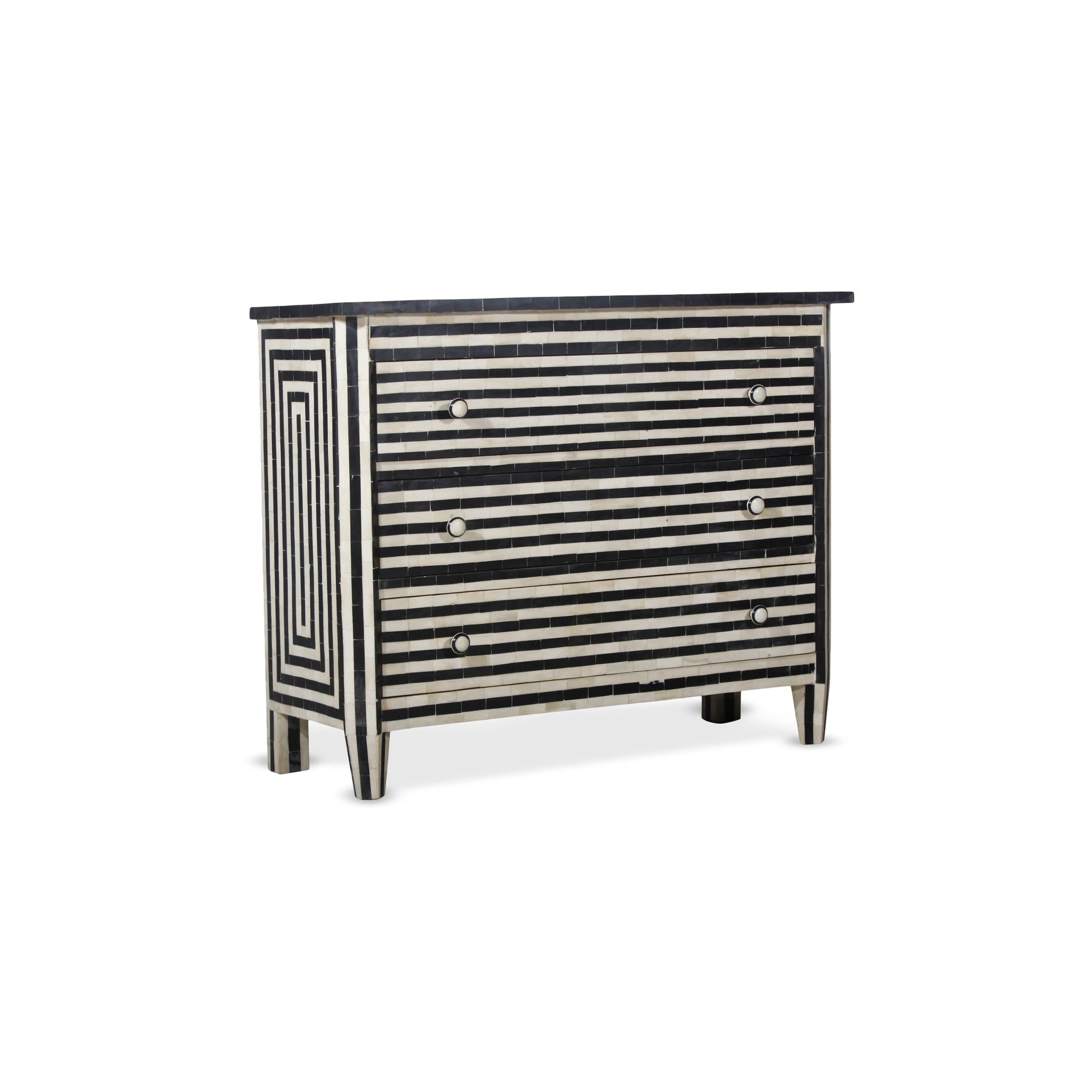 A striking combination of inlaid black and cream stripes run across the drawer fronts of our Shah Inlay Dresser, while nesting rectangles energetically adorn the side panels. To create this chest of drawers, the pieces to be inlaid are carefully cut into intricate shapes, polished, and applied to the frame in various patterns. Resin is then poured into the recesses to achieve a smooth, stunning surface that is both Old World and refreshingly modern.