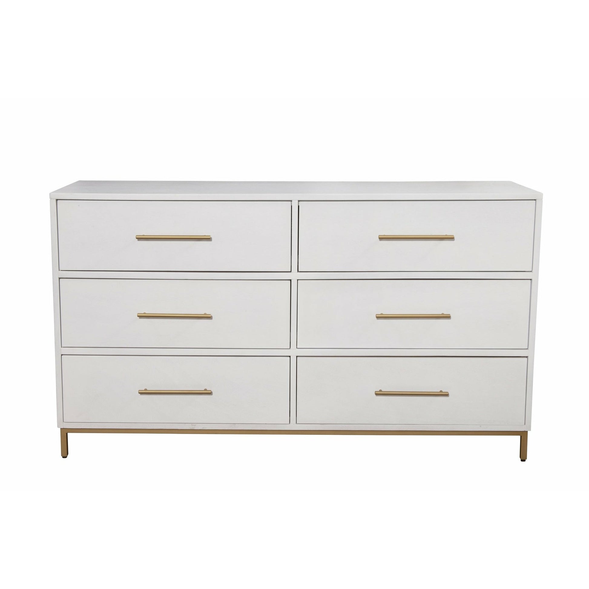 Add modern flair to your bedroom with the Madelyn White 6-Drawer Dresser. Providing storage for your essentials, this piece is crafted from sustainably sourced Mahogany. Features include a felt-lined top drawer, English dovetail construction and metal ball bearing drawer glides. The clean lines and beautiful finish blend effortlessly in any decorating scheme. Coordinates with other pieces in the Alpine Furniture Madelyn bedroom collection sold separately.