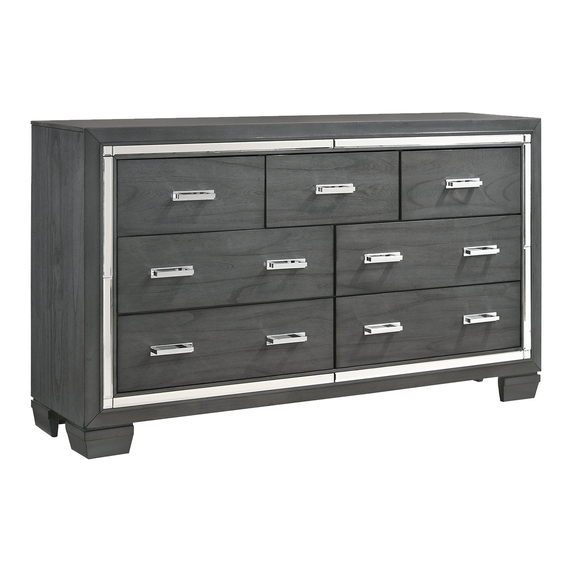 The Titanium 7-Drawer Dresser is the perfect addition to your home! This bedroom dresser offers plenty of storage space, with its seven spacious drawers. The top drawers are felt-lined, protecting your more valuable items, while the bottom drawers feature a dust proofing layer to help keep your belongings in tact. On the front of the dresser, a mirror glass trim frames the dresser; adding extra flair to this already stylish piece. The sleek, chrome handles pair perfectly with the trendy, gray finish. Bracket feet complete the look of this bedroom staple.