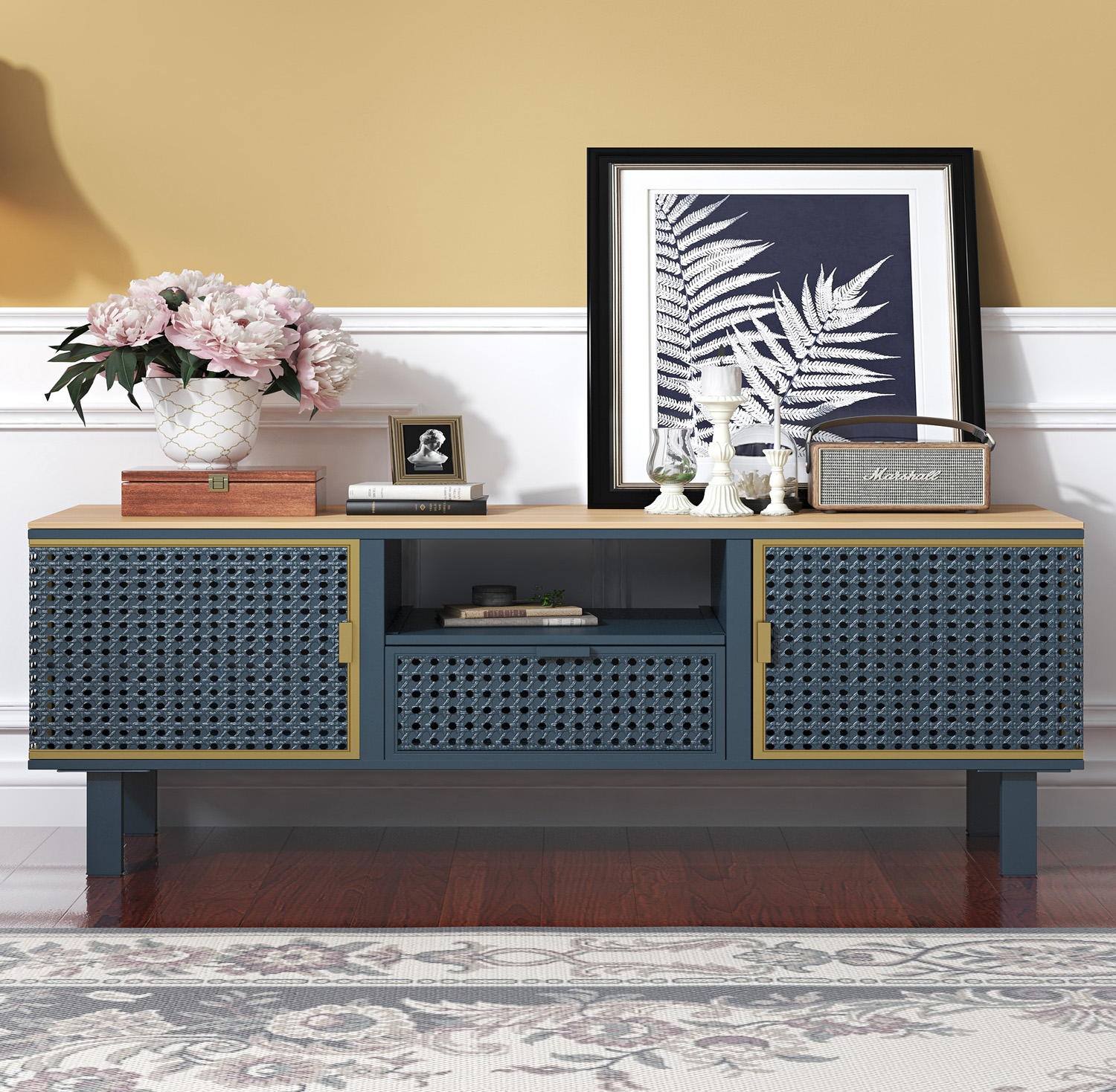 SYNGAR's New TV stand for TVs up to 50" brings modern style to your home. This TV stand is made of iron and carbonized bamboo, with a stable and strong frame and strong load-bearing capacity. There is a treated MDF board on the stand surface, which is silky and smooth, which can ensure that your TV can be placed stably. With three open storage compartments, this TV stand is perfect for storing DVDs, electronics, and other living room necessities, making your home more organized. This TV stand has a blue finish, a novel color scheme, and a unique design. It is a good choice to show your high-level taste!