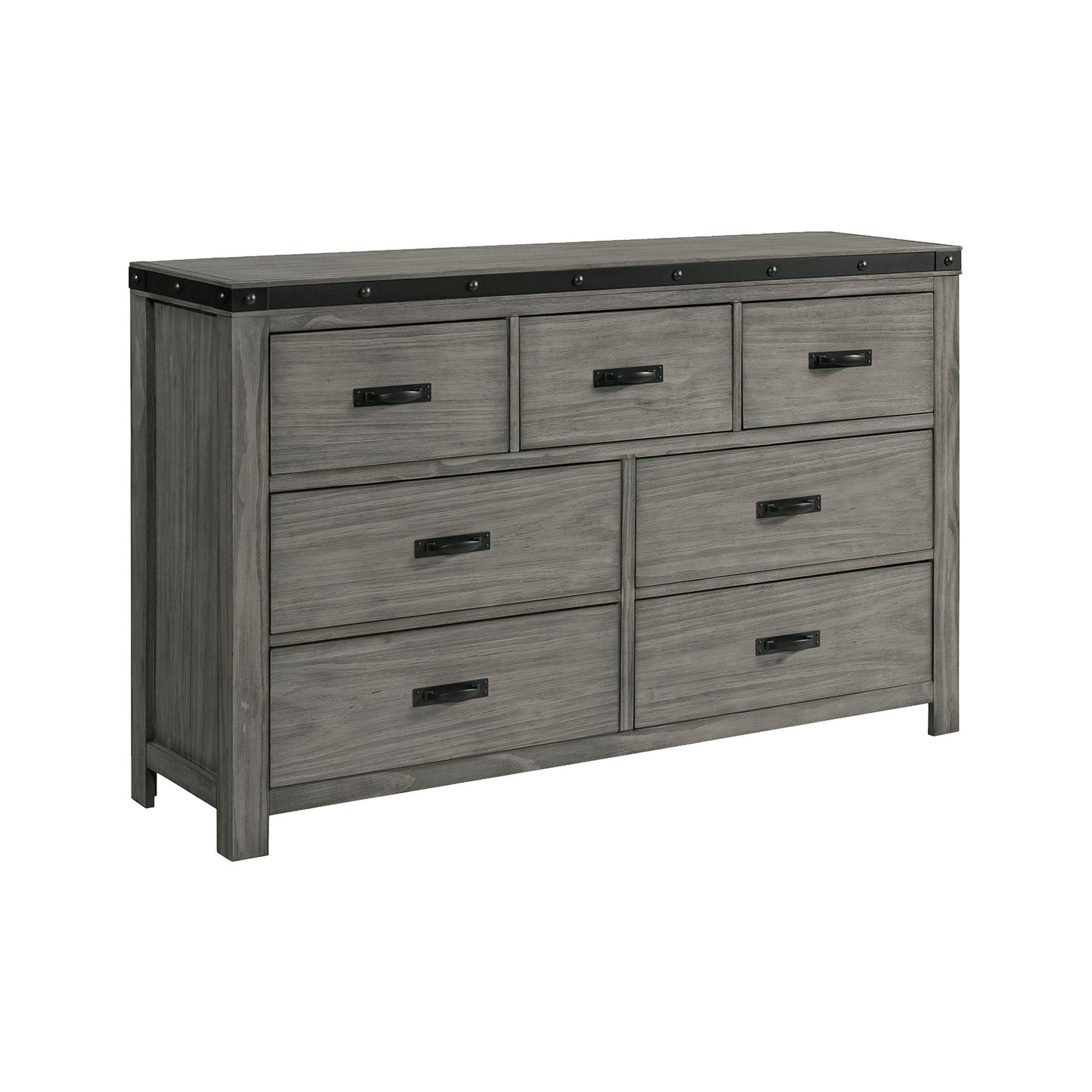 The Wade 7-Drawer Dresser is the ultimate dresser for your home! This bedroom staple comes with seven, spacious drawers; perfect for easily keeping all of your belongings neatly stored away. The bottom drawer features a dust proofing layer to help protect your belongings. The drawer pulls and trim along the top of the chest are both metal with a black finish. Along the trim on the dresser are decorative bolts, adding a little extra flair. This dresser is finished in a neutral gray, making it easy to pair with any existing decor or to find an excuse to completely redo your bedroom. Please note wood grains vary piece by piece and will not look exactly like the picture.