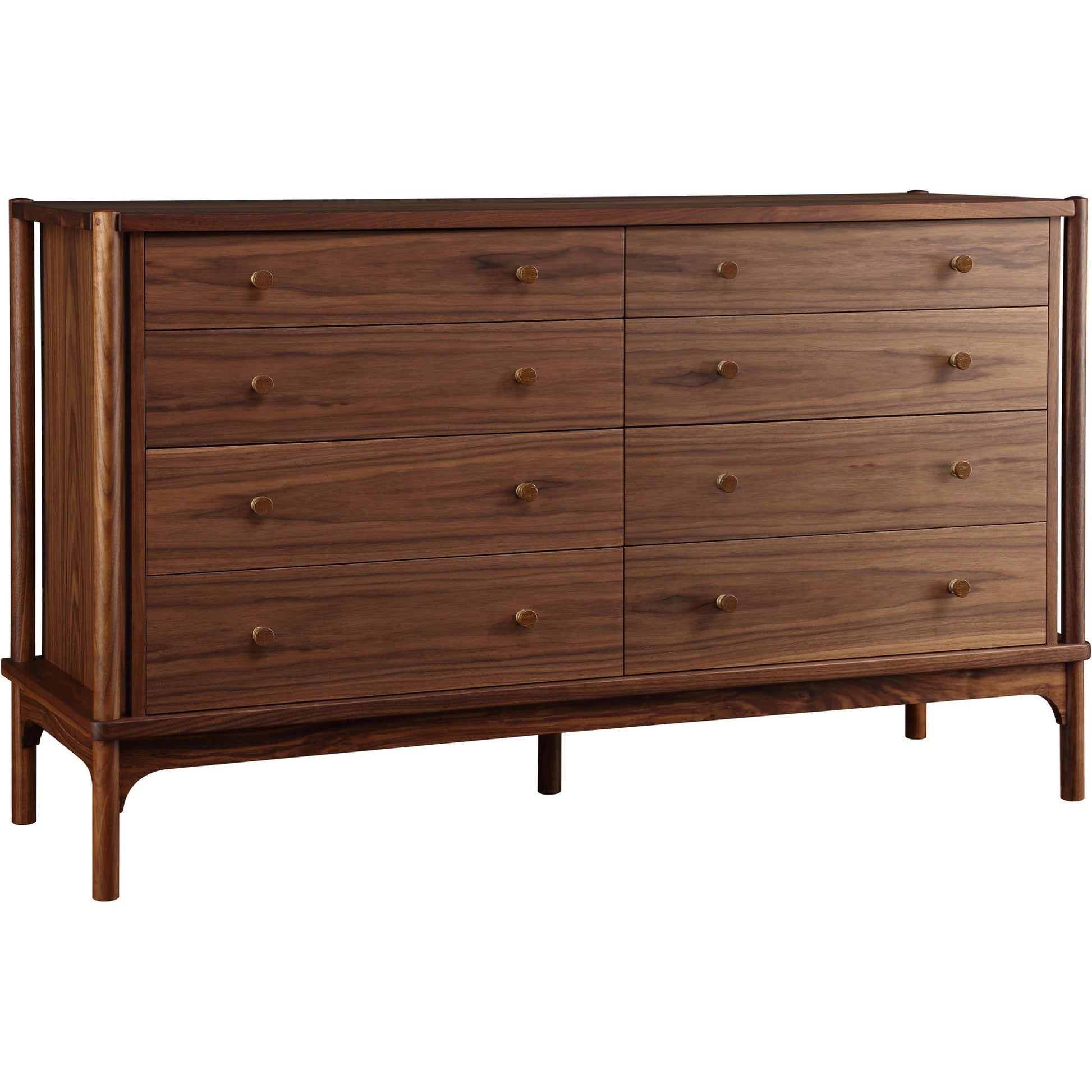The Walnut Grove Dresser 8-Drawer exemplifies sophistication. Crafted with American Black Walnut and featuring four round corner posts and a beautiful wood-turned knob with brass detail, this dresser offers tasteful luxury. With eight side-hung, center-guided drawers, it is the perfect addition to the Stickley Walnut Grove Collection.