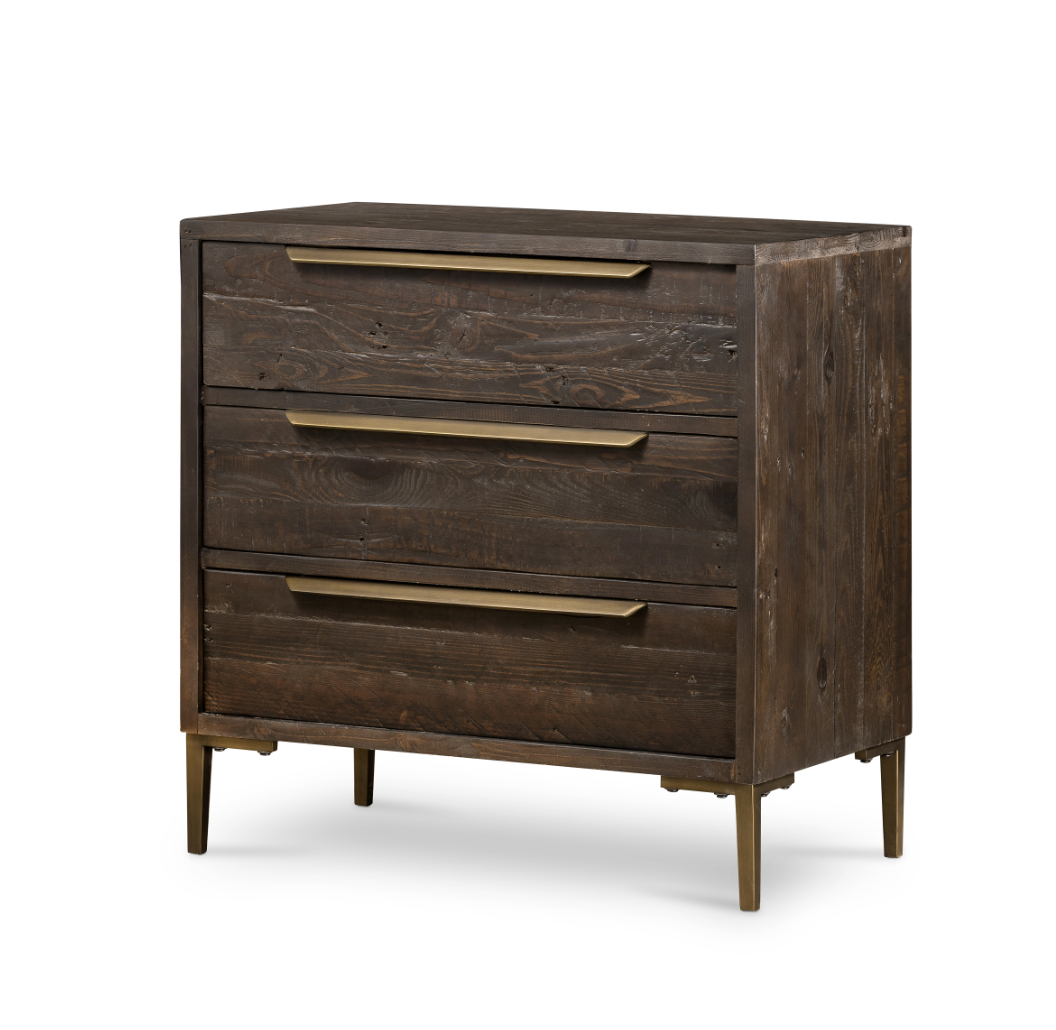 Reclaimed pine takes on a deep carbon tone, letting natural graining emit its innately rich character. Slim legs and flat, antique brass-finished iron hardware place a fresh spin on a streamlined form. Three drawers for ample bedroom storage.